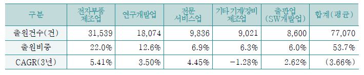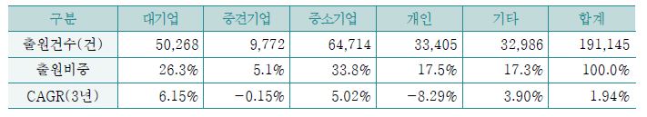 • 특허청과 한국지식재산연구원 특허통계센터는 2024년 3월, 지식재산 주요통계를 신속하게 제공하기 위해 2023년 잠정통계를 기반으로 “지식재산 통계 FOCUS(통권23호)”를 공개함 • 본 소고는 “지식재산 통계 FOCUS”에서 일부 소개된 지역별 지식재산 통계를 근거로, 보다 자세한 지역 특허출원 동향에 대한 통계정보를 제공하고 시사점을 제시함 작성자 장인호(한국지식재산연구원 특허통계센터 선임연구원) 진병찬(한국지식재산연구원 특허통계센터 연구원) 정찬식(한국지식재산연구원 특허통계센터 센터장) ※ 본 보고서 내용은 필자의 개인적인 견해이며, 한국지식재산연구원의 공식적인 의견이 아님을 밝힙니다. ※ 본 보고서 통계수치는 「지식재산 통계 FOCUS(통권23호)」의 잠정치 데이터(2023년 3월 기준)를 바탕으로 산출되었습니다. □ 대기업 부문의 출원 증가와 혁신 창출 • 2023년 기준 지역 전체에서 전년 대비 4.03% 증가한 총 191,145건의 특허가 출원되었으며, 최근 3년간 전국 특허출원 연평균 증가율(CAGR)은 1.94%로 나타남 • 출원인 유형별로 CAGR이 가장 높은 그룹은 대기업으로 6.15%로 나타났으며, 가장 크게 감소한 그룹은 개인이 –8.29%를 기록함 • 출원인 유형별로 가장 높은 비중을 차지하는 그룹은 중소기업으로 33.8%로 나타났으며, 중견기업의 비중이 5.1%로 가장 낮은 비중을 차지함 □ 신기술 분야의 출원 증가와 지역성장 • 2023년 기준 지역에서 출원된 특허를 WIPO 기술분야별로 살펴보면, 전기공학 분야의 비중이 39.6%로 가장 높고, 다음으로 화학, 기계공학, 기구 및 기타 순으로 나타남 • WIPO 기술분야별 CAGR이 가장 높은 분야 또한 전기공학으로 7.28%로 나타났으며, 가장 크게 감소한 분야는 기타(토목공학, 기타소비재물품, 가구/게임)가 –7.60%를 기록함 • CAGR이 가장 높은 전기공학 분야의 경우 전기기계/에너지, 컴퓨터기술, 전자상거래 및 반도체 관련 세부 기술분야가 포함되어 있으며, 기구 분야 또한 의료기술, 측정 및 광학 등 첨단‧정밀 기술분야가 다수 존재하여 4차산업 중심 기술분야의 CAGR이 전반적으로 높게 나타남 □ 산업육성 전략과 지식재산 통계의 활용 • 2023년 기준 지역 기업(개인 및 기타 미분류 제외)에서 출원된 특허를 출원기업의 산업(업종)별로 살펴보면 전자부품 제조업 분야의 출원 비중이 22.0%로 가장 높게 나타났으며, 상위 5개 산업의 출원 비중이 53.7%로 전체 절반 이상을 차지 • 지역 기업의 상위 5개 다출원 산업 분야는 전자부품 제조업(C26), 연구개발업(M70), 전문 서비스업(M71), 기타 기계/장비 제조업(C29) 및 출판업(SW개발업)(J58) 순으로 나타남 • 상위 5개 산업의 CAGR은 3.66%로 전체 평균(1.90%)의 약 2배에 가까운 증가율을 보였으며, 5개 산업분야 가운데 전자부품 제조업의 CAGR이 5.41%로 가장 높고, 기타 기계/장비 제조업의 CAGR은 –1.28%로 유일하게 하락하는 추세를 보임 |