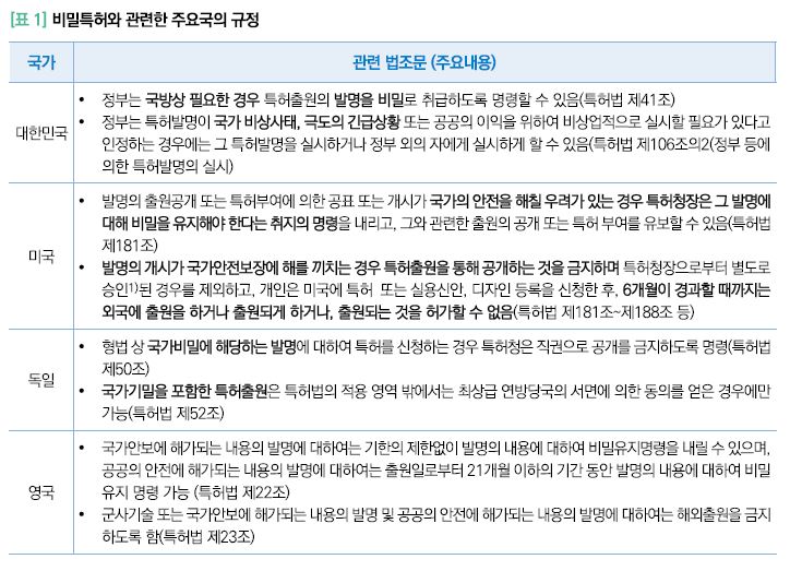 • 글로벌 무력충돌 이슈 증가, 글로벌 패권 경쟁 심화에 따라 국가안보에 대한 관심이 높아지는 가운데, 국가안보를 이유로 한 비밀특허 제도에 대해 비교법적 검토 필요성 존재 • 이에 본 보고서는 주요국의 비밀특허 제도 운용 방식과 관련 사례를 검토하면서 우리나라의 국방 관련 특허출원 제도의 개선방안 등을 검토해보고자 함 작성자 전정화 한국지식재산연구원 글로벌정책연구실, 부연구위원/법학박사 ※ 본 보고서 내용은 연구자의 개인적 연구 결과물로서, 한국지식재산연구원의 공식적인 의견이 아님을 밝힙니다. Ⅰ들어가며 □ 특허는 해당 기술분야의 통상의 지식을 가진 자가 실시할 수 있도록 충분하고 명확한 방식으로 공개하는 것이 원칙이나, 대부분의 국가는 특정한 발명에 대하여 비밀로 유지할 수 있는 규정을 두고 있음 • 발명의 공개된 정보는 새로운 혁신을 창출할 수 있으며 특허 만료된 발명은 다른 사람들로 하여금 해당 발명품을 자유롭게 생산ㆍ판매할 수 있게 함으로써 더 많은 수요를 충족시키는 등, 특허는 기술과 산업 발전에 필수적인 역할을 수행 • 또한 특허권이라는 독점의 인센티브는 발명자로 하여금 특허출원을 하도록 하는 동력을 제공할 수 있음. 달리 말하면 발명의 결실에 대하여 적절한 보호를 추구하지 않거나 독점권을 활용할 수 없게 한다면 발명자들은 특허출원이 아닌 다른 방식으로 자신의 기술을 보호를 추구할 수 있을 것임 • 하지만 ‘공개’라는 특허제도의 원칙에도 불구하고 특정한 기술분류에 해당하는 발명에 대하여는 비밀로 유지할 수 있는 구체적 절차를 규정하기도 함. 주요국들은 통상 국가안보라는 공통적인 인식 아래, 출원 공개가 이루어지지 않거나, 외국으로의 출원을 금지하거나, 등록 후에라도 권리를 행사할 수 없도록 하는 규정을 두고 있음 □ 일명 ‘비밀특허’ 제도는2) 외부 위협으로부터 국가의 방위와 국가핵심기술의 보호라는 측면에서 그 타당성이 있으나, 한편으로는 정부가 막강한 권한을 사용하여 과도하게 사인(私人)의 권리를 침해하고 기술혁신을 저해할 수 있다는 비판이 존재 • 각 국가마다 특허 시스템의 접근방식에 따라 비밀 대상의 기준이나 허가요건, 비밀 유지기간의 차이가 존재함. 그러나 국가적 접근방식의 차이에도 불구하고 모든 특허 시스템에서 공통적으로 나타나는 것은 일부 발명에 대한 정보는 특정상황에서 국가안보를 이유로 대중에게 공개되어서는 안 된다는 것임 - 특허의 본질이라는 관점에서 생각해 볼 때, 특허출원에 대한 비밀유지명령이 ‘일반인 발명자’의 기술혁신을 저해할 수 있다는 측면과 함께, 적절한 보상이나 이의 제기의 기회 등과 같은 보호 장치가 부족하다는 견해가 있음 - 미국 비밀특허 제도에 관한 연구에 따르면 상대적으로 비밀유지 기간이 길었던 특허가 비밀유지 기간이 짧았던 특허와 대비해봤을 때 인용될 가능성이 거의 15% 더 낮았음을 파악하였으며, 이를 통해 비밀유지명령이 새로운 발명품의 상업화를 방해했을 수도 있다는 분석도 존재함(Daniel P. Gross, 2019)3) • 따라서 국가안보에 영향을 미칠 수 있는 특허출원의 경우 비밀로 유지되어야 할 필요성이 있으나 이러한 제도 운용에는 합리적이고 투명한 절차가 전제되어야 하며, 발명이 공개ㆍ실시되지 못함으로 인하여 발생할 수 있는 출원인의 손실에 대해 상응한 보상체계가 마련되어야 함 - 우리나라의 경우 국방 관련 특허출원의 보상금 지급에 대해 청구인으로 하여금 보상금 청구서와 손실을 입증할 수 있는 증거자료를 제출하도록 규정하고 있으나 현실적으로 미실시로 인한 손실을 입증하기란 쉽지 않을 것임 - 또한 국방 관련 특허출원의 보상금액의 결정의 경우 ‘특허권의 수용’에 따른 보상금 산정 기준을 준용하고 있는데,4) 권리가 부여되기 전 비밀로 취급된 출원의 경우 해당 규정을 준용하여 보상금을 산정하기에는 어려움이 있음 □ 비밀특허제도에 대한 비교법적 연구를 통해 보다 구체적이고 합리적인 운용방안을 생각해 볼 필요성 존재 • 앞서 2022년 일본이 「경제안전보장추진법」을 제정하고 특허출원 비공개제도를 수립한 바 있으며, 이와 연계하여 비밀특허 제도의 기본적인 제도 설계를 비교한 선행연구들이 존재5) • 본 연구에서는 일본 외에 다른 주요국에서의 비밀특허 제도 규정과 실무를 살펴봄으로써 우리나라와의 비교를 실시함. 나아가 구체적인 운용방안 측면에서, 출원인에 대한 손실보상 제도를 중심으로 주요국 법제와 사례를 분석하여 국내적 시사점을 제시하고자 함 1) 해외출원허가제도(foreign filing license, FFL) 2) 우리나라의 경우 국방상 필요한 경우에 한하여만 비밀유지명령을 내릴 수 있도록 하나, 다른 나라의 경우 국가안전보장에 대한 위해, 국가기밀에 해당할 경우, 특정 기술분야에 해당할 경우 등 비밀유지명령의 포섭대상이 우리나라와 상이한 측면이 있다. 이에 이 글에서는 ‘비밀특허’라는 용어를 사용하여 우리나라의 국방관련 특허출원에 상응하는 주요국의 관련 제도를 살피고자 한다. 3) Daniel P. Gross, WWII Policy Kept Patents Secret, Slowed Innovation, National Bureau