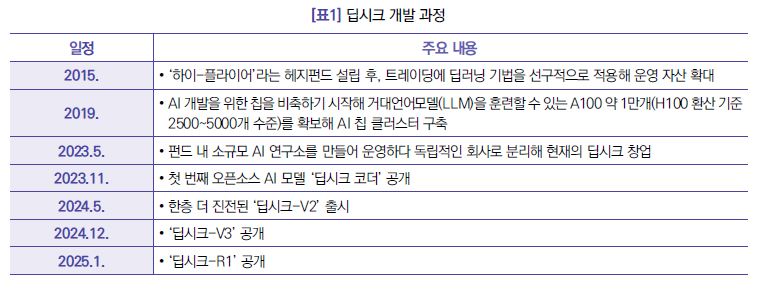 고유흠 한국지식재산연구원 법제도연구실 AI혁신정책센터, 선임연구원/법학박사수료 ※ 본 보고서 내용은 필자의 개인적인 견해이며, 한국지식재산연구원의 공식적인 의견이 아님을 밝힙니다. Ⅰ배경 및 현황 □ 딥시크 충격과 성능 • 저비용・고효율 모델인 딥시크(DeepSeek)의 출현으로 전 세계 AI 산업계에 큰 파장을 미침 - 딥시크는 미국의 對중국 제재로 저사양 칩을 활용하여 최적화된 모델을 개발하는 방식으로 하드웨어 비용 절감* * 메타의 최신 AI 모델인 Llama 3 모델을 엔비디아의 고성능 칩인 H100으로 훈련한 비용 대비 10% 수준(OpenAI의 5% 수준). 단, 딥시크가 밝힌 금액은 H800(H100의 대중 규제 회피를 위한 수출용버전) 약 2,000개를 시간당 2달러에 2개월 동안 빌린 비용을 계산한 것에 불과. 또한, 연구인력은 150명(데이터 부분 31명)으로, OpenAI 약 1,200명 대비 13% 수준 - 이를 통해 오픈AI, 구글, 메타 등 선도적인 AI 기업에 대한 의존도를 낮출 수 있는 계기를 마련 • 개발 소요 비용・시간 측면에서 경쟁사 대비 월등히 우월한 경쟁력을 갖추면서도 동시에 유사한 성능을 시연하여 뛰어난 가성비를 보유 - (수리적 추론 능력) 미국 수학경시대회 AIME 2024 벤치마크 테스트에서 79.8% 달성(오픈AI ‘o1’의 경우 79.2%) - (챗봇 성능) 딥시크-V3과 딥시크-R1은 UC버클리 연구원들의 챗봇 성능 평가 플랫폼인 ‘챗봇 아레나’에서 상위 10위 안에 랭크(2025.1.25. 기준) • 한편, 기존 AI 기업들이 구축해 왔던 폐쇄적 운영 구조에 반해, 개방형 오픈소스 모델을 제시 - AI 모델을 MIT 라이선스1)로 공개하는 오픈소스* 전략을 채택하여, 상업적 활용을 자유롭게 허가 * AI모델의 코드와 가중치를 공개했으나, 학습 데이터와 훈련 과정은 비공개. 이에 일부 개발자들은 ‘오픈소스’라고 부르기에 부족하다고 비판 - 개방성은 세계 개발자들에게 더 많은 선택권을 제공하여 AI 혁신 속도 가속화 및 기술 경쟁 구도에 긍정적인 변화 예상* * (데미스 허사비스 구글 딥마인드 CEO) “딥시크는 ‘매우 뛰어난 엔지니어링 능력’을 보여 줬으며, 지정학적 차원에서 중요한 변화를 가져올 수 있다”고 언급 □ 딥시크의 출현과 AI 모델 개발 생태계의 변화 • 개방성을 가진 AI 모델을 전 세계 개발자들이 활용함으로써 모델의 성능이나 오류를 협력하여 지속적으로 개선할 수 있어 AI 기술의 발전 가속화 - 이러한 오픈소스 모델의 접근성과 활용성으로 인해, 기존의 폐쇄형 모델을 제공하는 AI 선도기업의 경쟁력이 약화될 가능성 존재 • 저비용의 AI 개발 가능성으로 스마트폰, 자동차, 로봇 등 엣지 디바이스2)의 AI 탑재를 촉진할 전망 - 중국에서는 딥시크 열풍으로 중국 자동차 제조기업, 금융기업, 스마트폰 제조기업 등에서 딥시크를 탑재*하는 추세이며, 엣지 디바이스용 AI 모델의 고도화는 새로운 시장을 창출 및 활용으로 인한 대중화 제고 * 중국 전기차인 BYD는 딥시크를 자사 차량에 적용하기로 했으며, 다른 자동차 제조사들도 AI 모델을 활용해 운전 중 음성명령 기능 등을 향상시킬 계획을 추진 • 저비용・고효율의 딥시크 출현으로 고성능 반도체에 대한 수요 감소 및 중저가 등 레거시 반도체에 대한 수요 증가 등 AI 반도체 생태계 변화 가능 - 딥시크의 경우 경쟁사 대비 GPU 사용량 약 9%만 필요하여, 고성능 GPU 수요 감소 및 연구개발 동력 상실 가능성 존재 - 저사양 GPU와 최적화된 알고리즘으로 고성능 반도체의 의존도가 경감될 수 있어, 연구개발 환경이 빅테크 중심에서 스타트업 중심으로 변화 전망 - 엔디비아의 고성능 칩 수요가 AMD, Intel, ASIC 등의 중저가 칩 수요로 대체될 가능성 및 중국산 제품 수요 증가 가능성 등에 따라 저사양 GPU 활용 추세에 맞춰 차별화된 메모리・패키징 솔루션 개발 기대 □ 경량화 AI 모델 개발을 위한 지식증류의 활용 • 딥시크는 AI 모델 경량화를 위해 전문가 혼합3) 방식과 FP84) 기술을 사용하여 강화학습을 수행하면서, AI 모델의 정확도를 높이기 위해 지식증류(Knowledge Distillation)5) 기술을 활용한 것으로 추정 - 지식증류는 대형 AI 모델(교사 모델)의 지식을 소형 모델(학생 모델)로 이전하여 AI 모델 훈련 비용을 낮추면서도 추론 속도를 향상시킬 수 있어, 효율적인 실시간 응답이 가능 - 또한 교사 모델과 유사한 성능을 유지하면서도 크기를 줄일 수 있어, 모바일 및 엣지 디바이스에서도 원활히 작동하기에 적합 • 경량화된 AI 모델 개발을 위해 저비용의 AI 학습 방법인 지식증류의 활용이 활성화될 것으로 전망 - 지식증류 방식을 통해 AI 모델 개발 비용이 감소하게 되어 더 많은 AI 서비스가 출현하고 스타트업이 AI 기술에 접근할 수 있는 환경을 조성할 것으로 기대 2 현황 □ AI 모델 개발 관련 지식재산 이슈의 변화: 저작권 침해 → 데이터 도용 • 그동안 AI 모델 개발과 관련된 지식재산 이슈는 AI 모델의 학습과정에서 발생하는 저작권 침해 이슈가 중심이었으나, 후발주자들의 선두그룹 AI 모델을 대상으로 학습하는 지식증류 기술로 인해 데이터 도용 이슈로 확대 - 기존에는 주로 방대한 뉴스 저작권을 보유한 언론사들이 AI 개발사들을 대상으로 저작권 침해 소송을 제기하였고, 이에 OpenAI 등은 학습