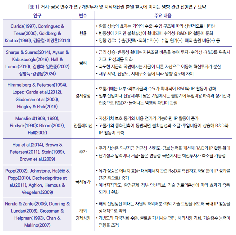 • 경제성장에 대한 기여도가 큰 기업들의 R&D 투자와 IP 활동이 어떠한 거시・금융 여건에서 촉진되거나 제약되는지를 파악하는 것은, 혁신정책과 금융정책을 설계하는 데 핵심적인 과제 • 본 연구는 금리・환율・물가・유가・주가 등 국내외 거시・금융변수가 기업 특허출원・연구개발비에 미치는 영향을 분석 • 거시・금융 변동이 중소기업 R&D와 특허 활동에 미치는 상대적으로 높은 취약성을 감안하여, 기업 규모와 재무 여건을 고려한 차별화된 R&D・IP 지원 및 위험관리 정책을 설계・운영할 필요가 있음 작성자 장병득 (한국지식재산연구원 경제산업연구실, 부연구위원) ※ 본 보고서는 「혁신・경제 연구 – 금융변수가 기업의 연구개발투자와 지식재산 성과에 미치는 영향(2024)」 보고서의 일부 내용을 기반으로 수정・보완한 것이며, 한국지식재산연구원의 공식적인 의견이 아님을 밝힙니다. Ⅰ연구 배경 □ (연구 배경) 지식기반경제(knowledge-based economy)에서 과학기술은 경제 성장의 주요 원천 • 특히, 기업의 연구개발(R&D)과 지식재산(IP) 활동은 국가 경제 성장에 있어 중요한 요소 - 2024년 출원인 유형별 IP 출원 비중(특허청, 2024): 기업 46.8%, 내국 개인 32.8%, 외국 법인 12.0% - 2023년 R&D 지출 비중(과학기술정보통신부, 연구개발활동조사): 기업 79.2%, 공공연구기관 11.7%, 대학 9.1% • 경제성장에 대한 기여도가 큰 기업들의 R&D 투자와 IP 활동이 어떠한 거시・금융 여건에서 촉진되거나 제약되는지를 파악하는 것은, 혁신정책과 금융정책을 설계하는 데 핵심적인 과제 • 그러나 기존 연구는 주로 전체 지식재산권 출원량의 장기 추세나 개별 변수의 영향에 초점을 두어, 거시・금융 환경을 체계적으로 반영한 분석은 상대적으로 부족 - 지식재산권 출원 활동은 장기적으로 증가하고 있으나 경기・금융 여건에 민감하게 반응하고 있으며, 특히 재무 여력이 취약한 중소・벤처기업은 금리・환율 등의 변동성에 더 큰 영향을 받을 수 있음(Murtagh and Bessler, 2003; Olugbode and Pointon, 2014; 안순권, 2010; 김윤철・이명훈, 2014) - 주가(기업가치), 금리(자본조달 비용), 환율과 원자재 가격(수출입 가격 및 마진)과 같은 거시・금융 변수들은 기업의 투자 여력과 기대수익률을 통해 R&D 투자와 IP 전략(출원, 권리화, 유지)에 직・간접적인 영향 - 그럼에도 불구하고 금리・환율 등 금융변수가 기업 수준의 R&D 투자와 IP 성과에 미치는 영향을 체계적으로 분석한 연구는 제한적이며, 특히 기업 규모(대기업 vs 중소・벤처)에 따른 이질성을 함께 고려한 실증 분석은 부족한 실정 - 본 연구는 이러한 연구 공백을 보완하고자, 거시・금융 변수와 기업의 R&D・IP 활동 간 관계를 정량적으로 규명하는 데 목적 □ (선행연구) 국내외 거시・금융 변수들은 기업의 연구개발 활동과 지식재산권 출원에 다양한 방식으로 영향 • 경제성장률, 인플레이션, 금리, 환율, 유가 등의 변화는 기업의 재정 상태, 투자 우선순위, 자금 조달 능력, 혁신 전략 등에 변화를 초래하여 R&D와 IP 출원에 직・간접적인 영향을 미칠 수 있음 • 경기・물가 변화: 경제성장, 인플레이션 - 경기 호황기에는 자금 여력과 수요가 확대되어 R&D와 IP 활동이 강화되지만, 일부 산업이나 상황에서는 불황기에도 역행적으로 R&D・IP가 늘어날 수 있음 - 인플레이션의 영향은 복합적이며, 비용 전가와 자산가치 보호가 가능하면 IP가 늘 수 있지만 고물가와 긴축이 동반되면 R&D와 IP가 위축 • 금융 시장 환경 변화: 금리, 주가 - 금리 상승과 변동성 확대는 자본조달비용을 높여 수익성을 약화시키며 R&D와 IP 활동을 위축 - 완화적 금리와 주가 상승은 외부자금 접근성과 기업가치를 개선해 R&D와 IP를 확대시키지만, 단기성과 압력이나 과도한 완화 국면에서는 혁신투자가 위축될 가능성도 있음 • 대외 경제환경 변화: 환율, 국제 유가, 해외 경제성장 - 환율 효과는 기업의 수출・수입 구조에 따라 상반되며, 환율 변동성 확대는 대외 불확실성을 높여 R&D와 IP를 둔화 - 국제 유가 상승은 에너지효율・대체에너지 중심의 R&D와 IP를 촉진하는 반면, 해외 산업생산 확대는 자원의 해외배분을 유도해 국내 IP 활동을 약화 ![]() □ (연구 목적) 기업의 R&D 투자와 특허출원 활동이 거시・금융환경에 어떻게 반응하는지 계량적으로 분석 • 기업의 R&D 투자와 특허출원 활동에 영향을 미치는 금융변수를 파악하고 기업 유형별(대・중소)로 금융변수의 변동성에 대한 반응을 분석 - 국내 거시・금융변수와 해외 금융변수가 기업의 연구개발비와 특허출원에 미치는 영향을 종합적으로 분석 - 기업 유형별(대기업 vs 중소기업)로 금융변수 변동성에 대한 R&D・특허 출원 반응을 비교・분석 • 기업 맞춤형 R&D 및 IP 출원 활동을 증진하기 위한 정책적 시사점을 도출 - 국내외 거시・금융환경 충격 시나리오에 기초하여 기업 규모별 맞춤형 R&D・특허 민감도를 계량화하고, 그 결과를 토대로 기업 맞춤형 R&D 및 특허 출원 활동을 촉진하기 위한 지원・위험관리 정책의 시사점을 도출 (이하생략) |