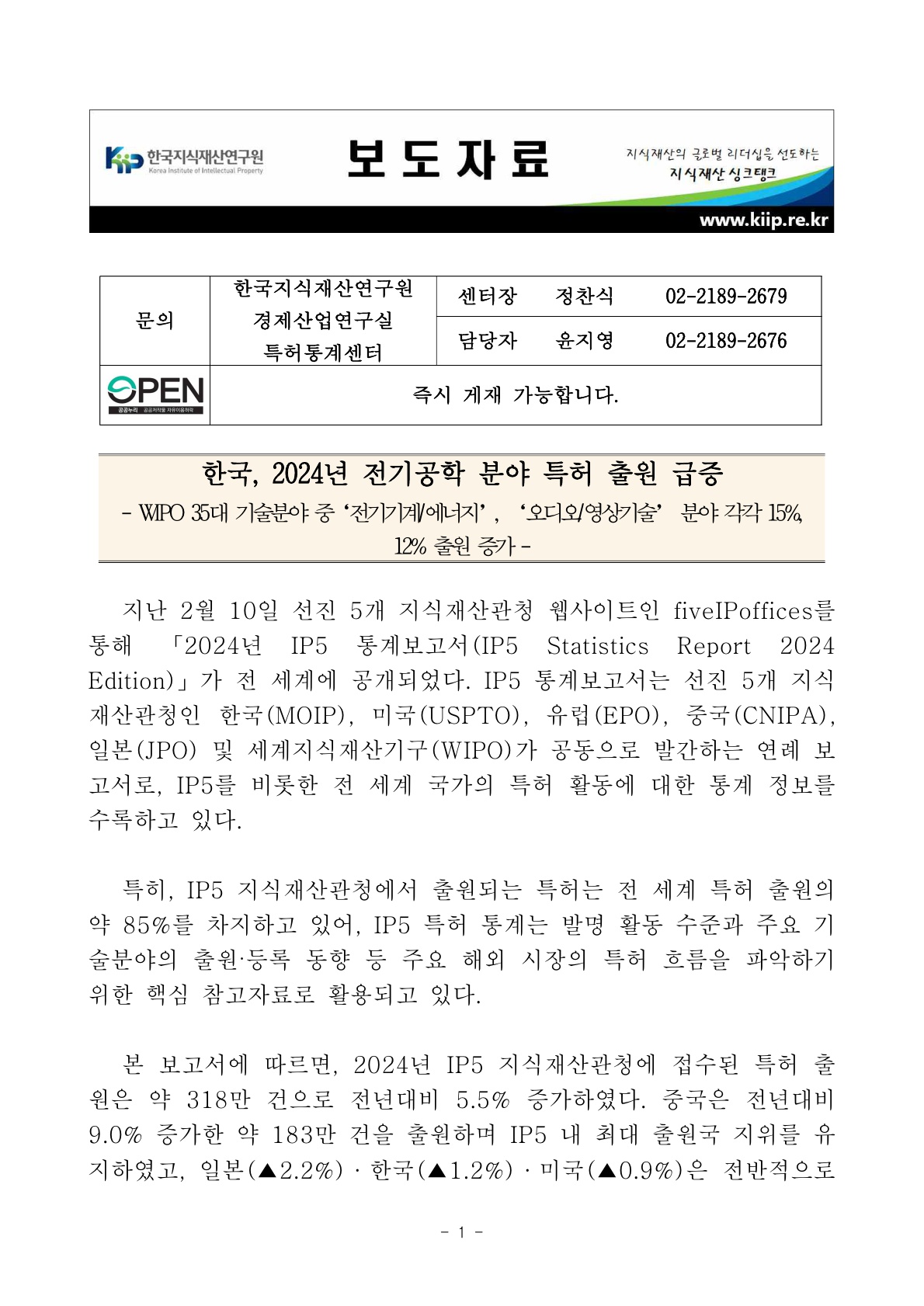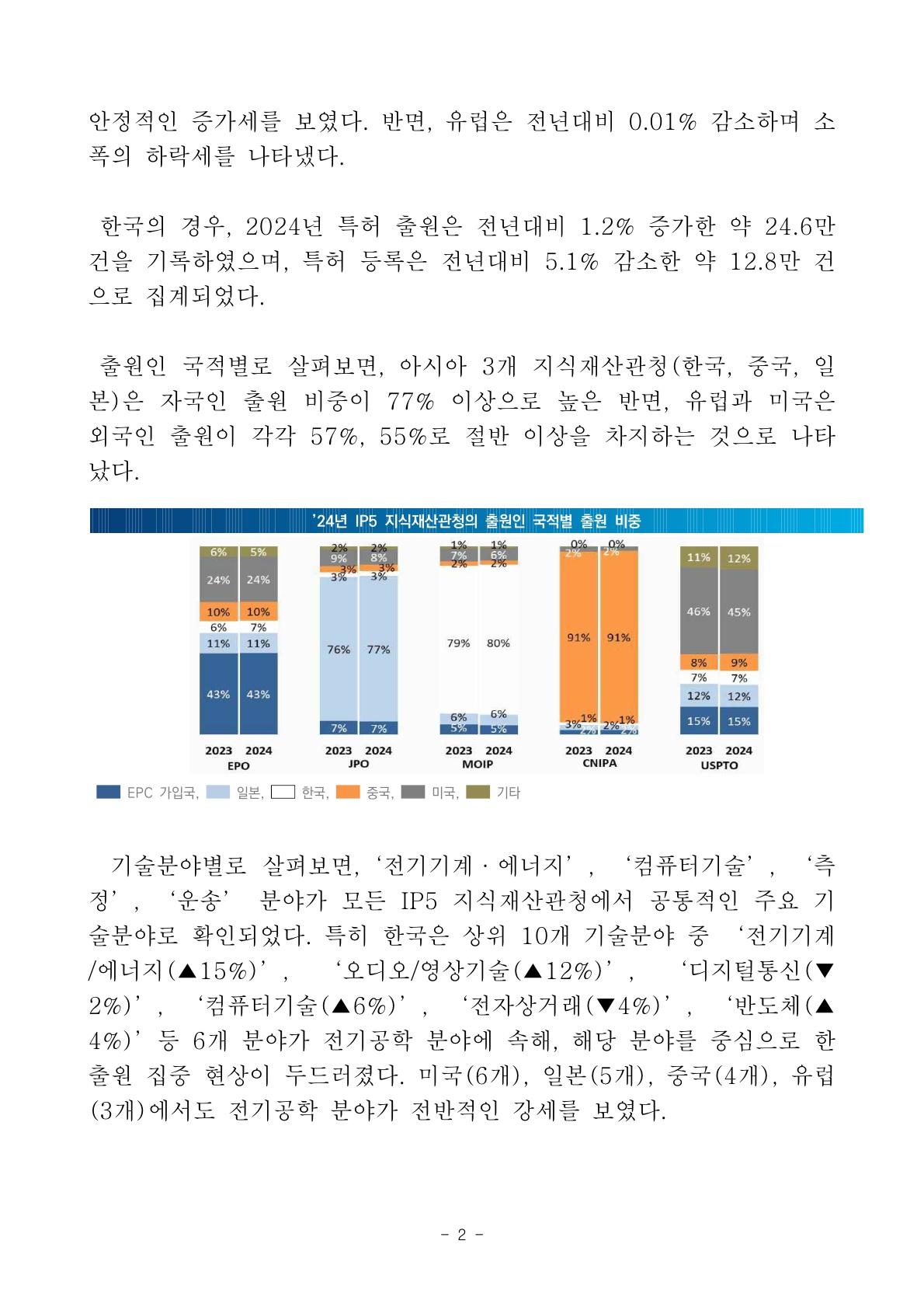 | 한국, 2024년 전기공학 분야 특허 출원 급증 |
