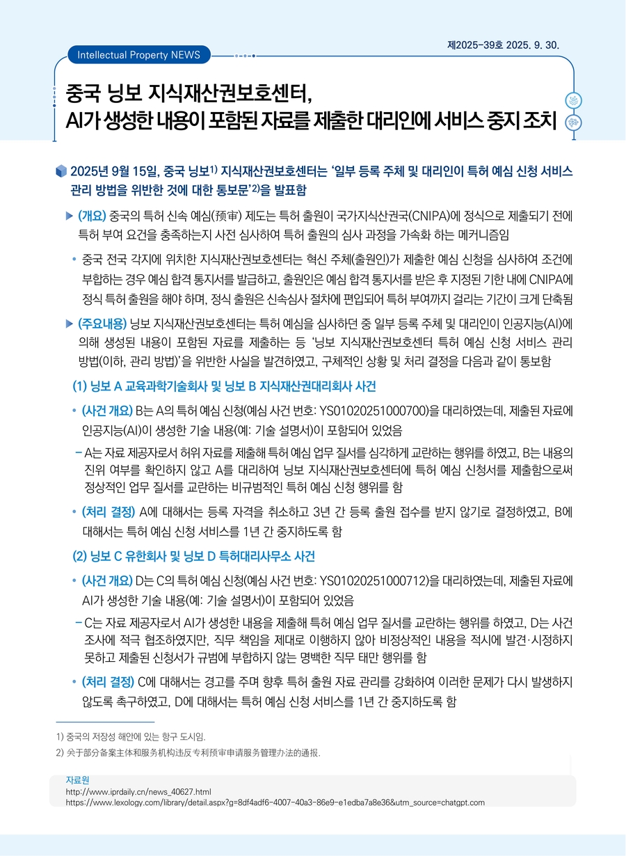 중국 닝보 지식재산권보호센터, AI가 생성한 내용이 포함된 자료를 제출한 대리인에 서비스 중지 조치