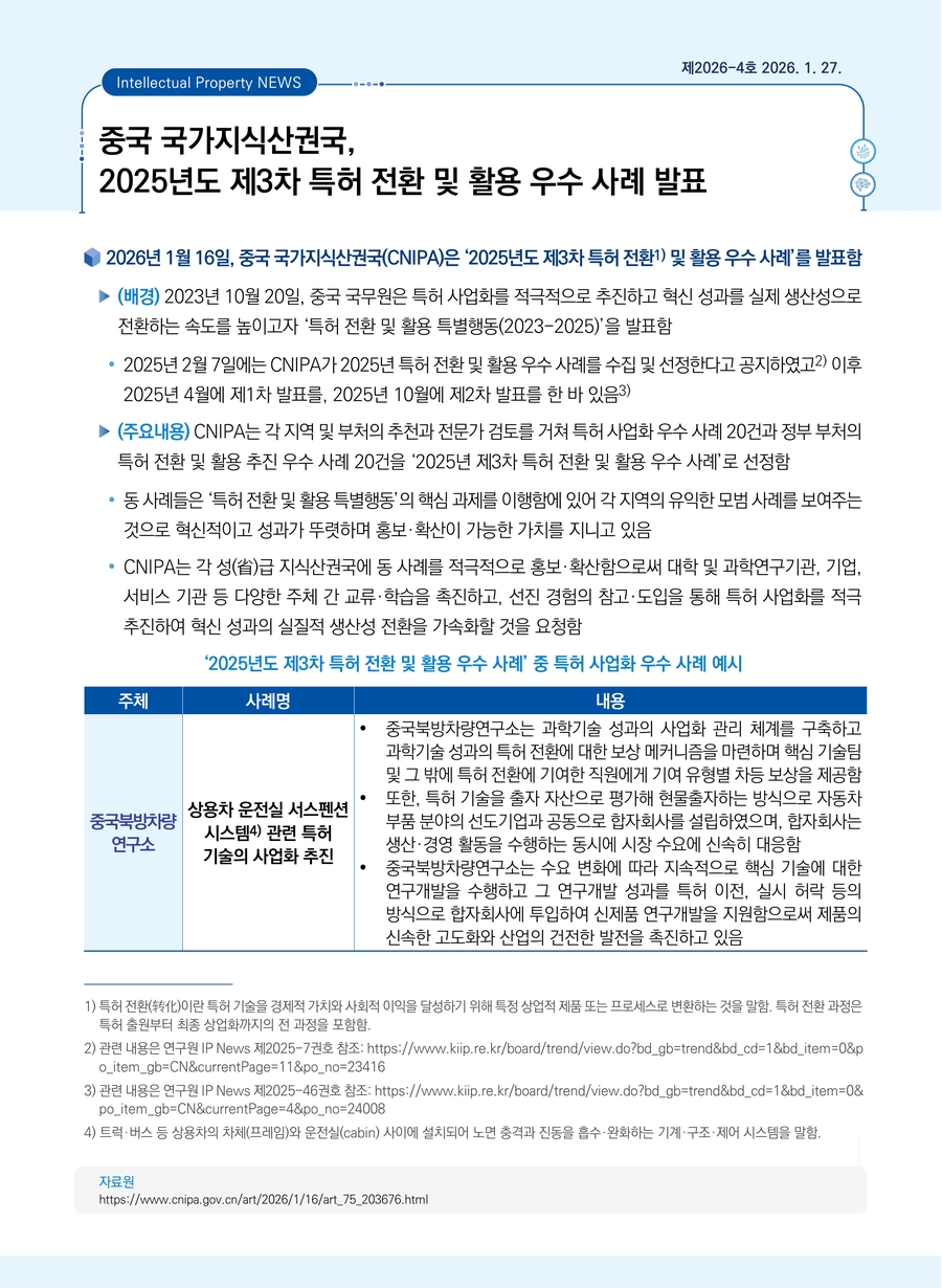 중국 국가지식산권국, 2025년도 제3차 특허 전환 및 활용 우수 사례 발표