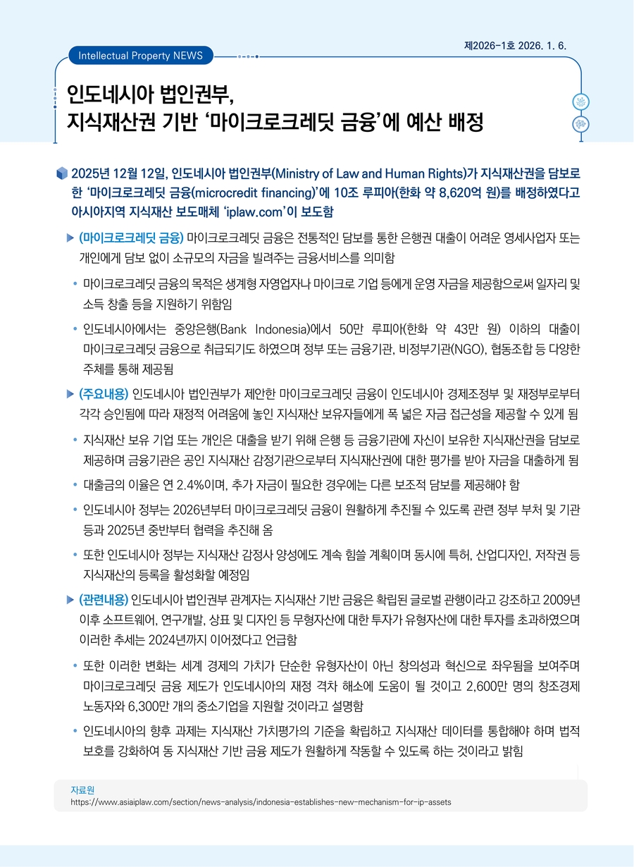 인도네시아 법인권부, 지식재산권 기반 ‘마이크로크레딧 금융’에 예산 배정