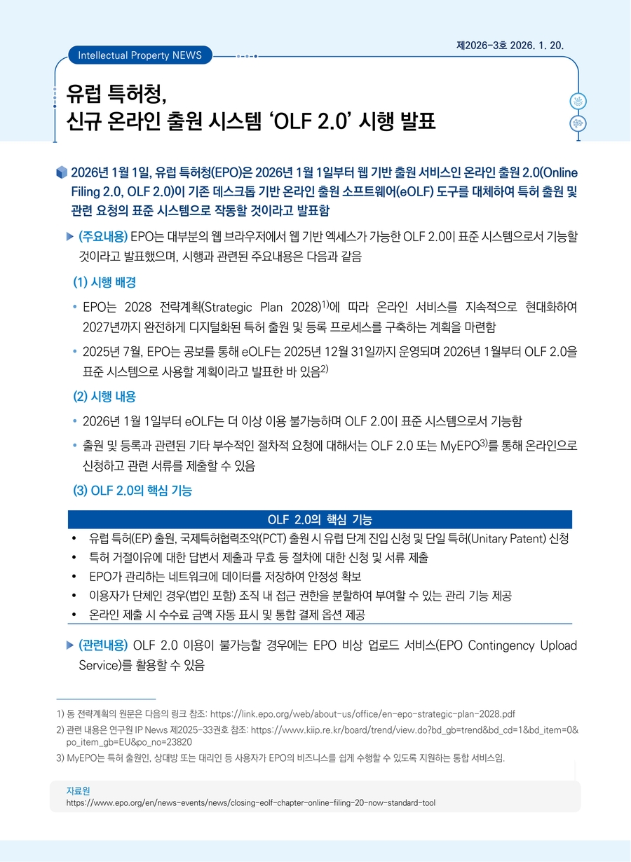 유럽 특허청, 신규 온라인 출원 시스템 ‘OLF 2.0’ 시행 발표