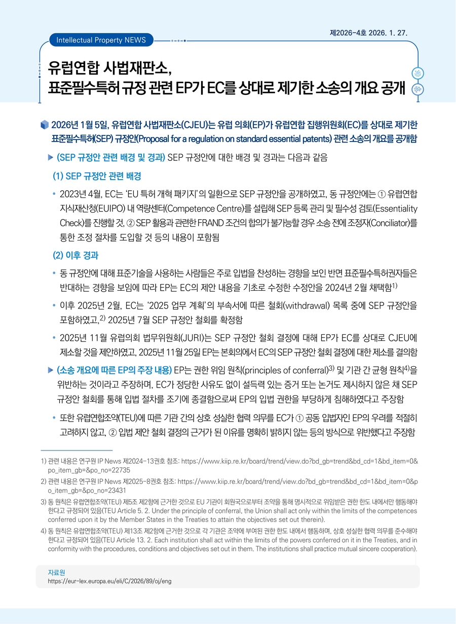 유럽연합 사법재판소, 표준필수특허 규정 관련 EP가 EC를 상대로 제기한 소송의 개요 공개