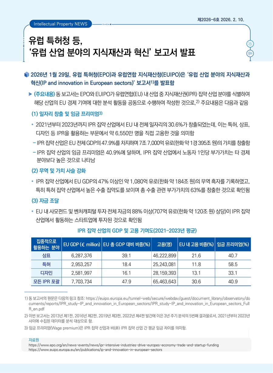 유럽 특허청 등, ‘유럽 산업 분야의 지식재산과 혁신’ 보고서 발표