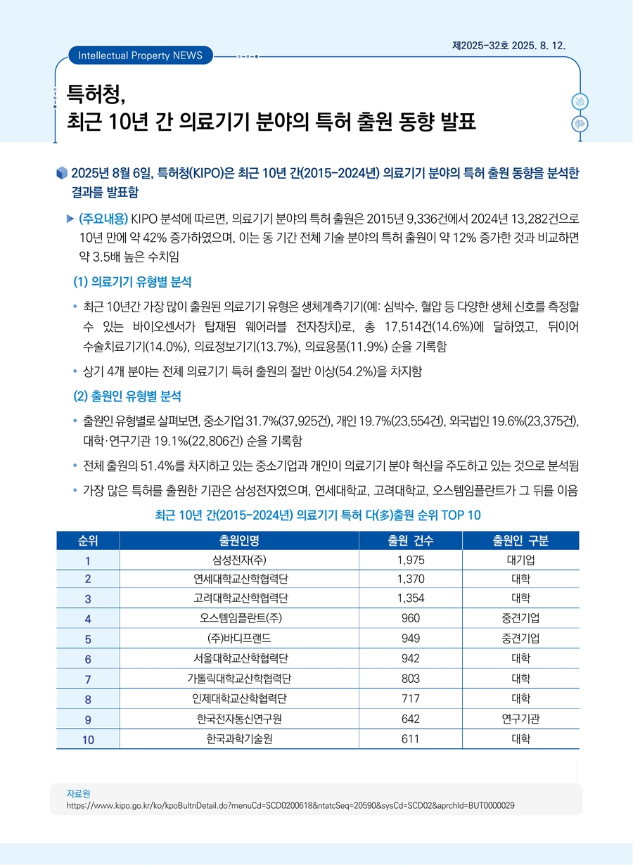 특허청, 최근 10년 간 의료기기 분야의 특허 출원 동향 발표