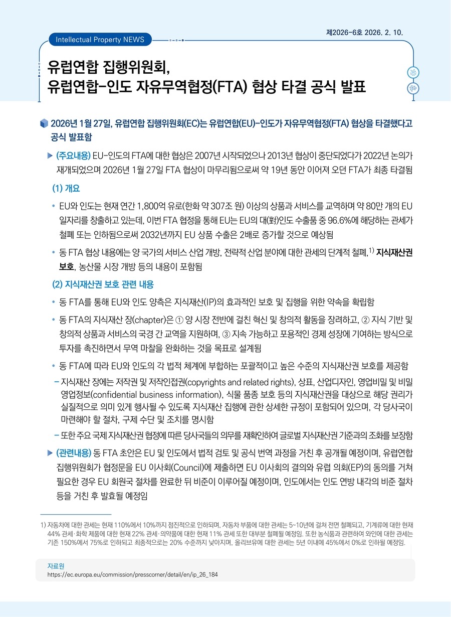 [통상] 유럽연합 집행위원회, 유럽연합-인도 자유무역협정(FTA) 협상 타결 공식 발표