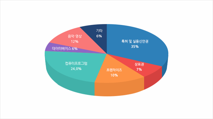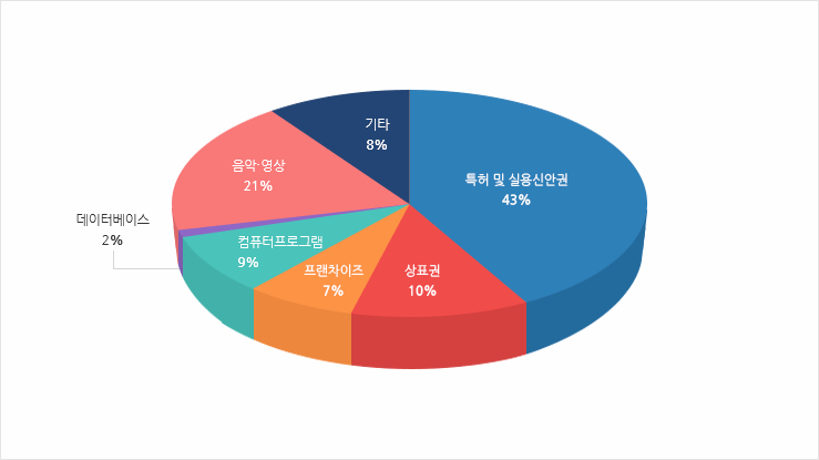 지식재산권 유형별 수입 비중은 특허 및 실용신안권 43%, 음악ㆍ영상 저작권 21%, 상표권 10%, 컴퓨터프로그램 9% 등으로 4개 항목이 83%를 차지