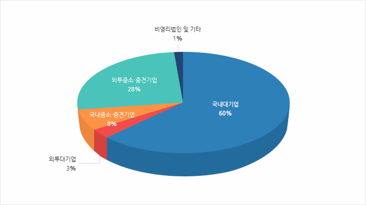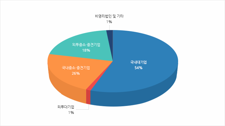 기관형태별 지식재산권 수입 비중은 대기업 63%, 중소․중견기업 36%로 수출의 경우보다 대기업 집중도가 더 높은 수준
