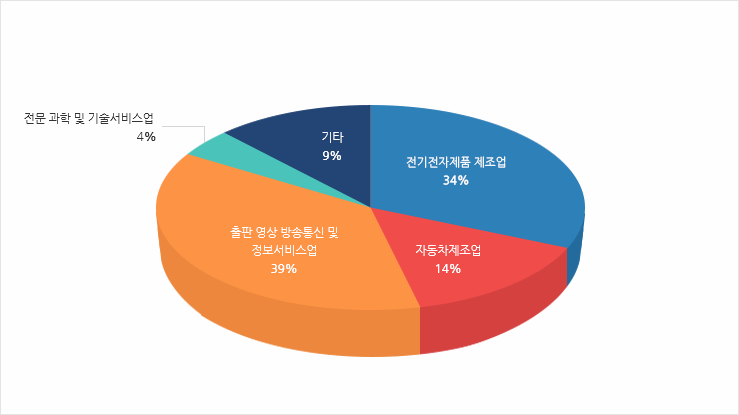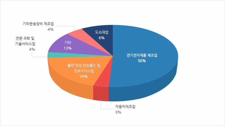 산업별 지식재산권 수입 비중은 전기전자제품 제조업 50%, 출판·영상·방송통신 및 정보서비스업이 20%로 2개 산업이 70%를 차지