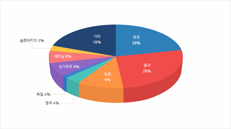 2014년중 거래상대방 국가별 지식재산권 수출 비중은 중국 28%, 미국 20%, 일본 9%로 3개국이 57%를 차지