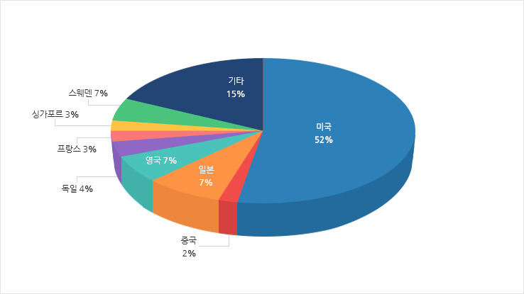 국가별 지식재산권 수입 비중은 미국이 52%로 수출의 경우보다 미국 집중도가 더 높은 가운데 일본, 영국, 스웨덴이 각각 7% 수준으로 이들 4개국이 73%를 차지