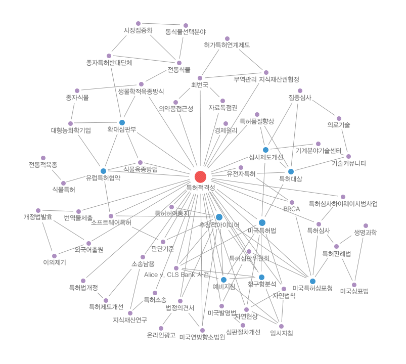 이렇듯 특허적격성은 전통식물에서부터 식물신품종, 의약품 및 소프트웨어 특허에 이르기 까지 다양한 분야에서 광범위하게 언급되고 있으며, 특허심사 및 심판절차 개선에 있어서 핵심적인 요소로 다루어 지고 있는바, 이번 6월호 뉴스포커스에서는 “특허적격성”을 중심으로 연계되어있는 다양한 정책동향에 대한 키워드 분석을 실시하였다.
