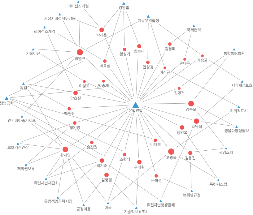 유럽연합을 중심으로한 다양한 연구주제와 연계해서 한지영, 박영규 및 강준모 등 주요 연구자들의 인력맵이 다음과 같이 형성되었다.