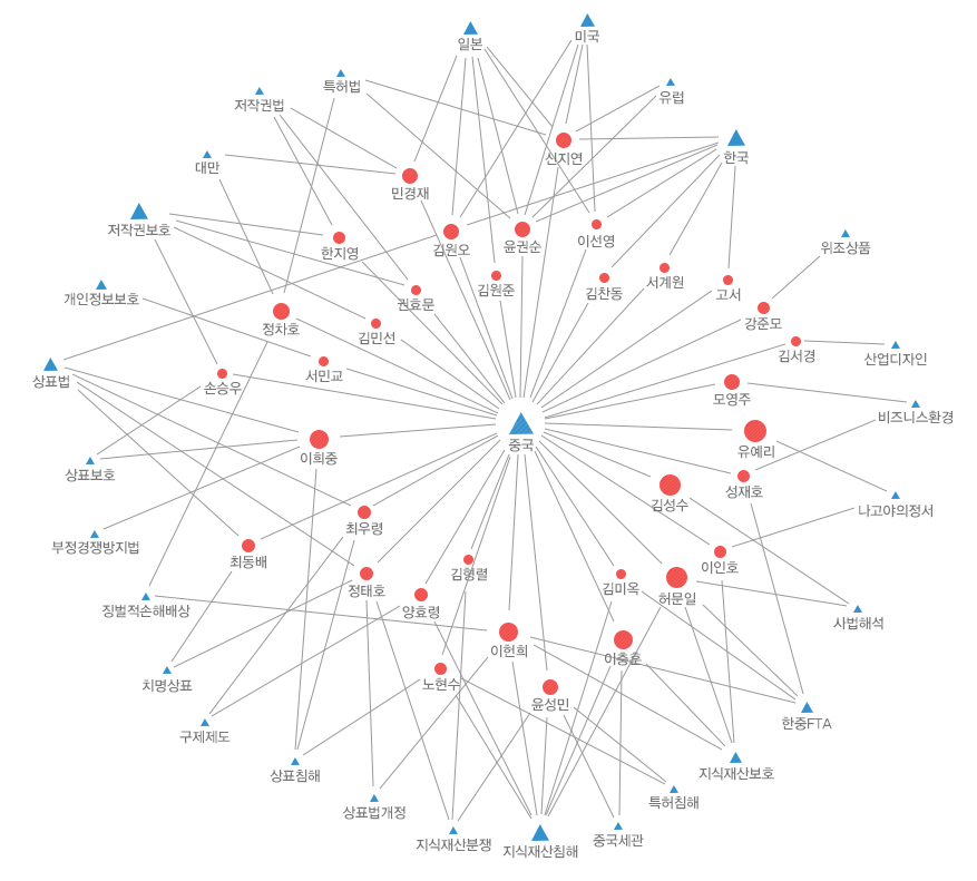 IP 인력맵에서는 중국의 지식재산법, 제도 및 관련 정책 등을 주제로 발간된 논문, 보고서 등의 저자정보를 활용해 IP 전문인력의 네트워크를 분석하였다.