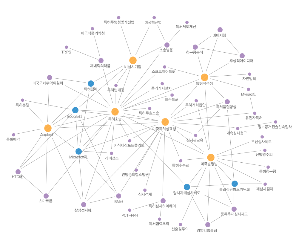 이번 11월호 뉴스포커스에서는 Focus on IP5 네번째 국가로 글로벌 지식재산 체계를 주도하고 있는 미국을 선정하였다. 분석을 위해 한국지식재산연구원에서 발간된 「Issue & Focus on IP」 가운데 2009년~최근까지 미국에서 수집된 기사를 통해 키워드 분석을 실시하였으며, 키워드 분석결과 미국에서는 ‘특허소송’ 키워드의 중요도가 가장 높게 나타났다. 이외에도 ‘미국발명법’, ‘특허적격성’, ‘비실시기업’ 및 ‘특허품질향상’ 등의 핵심 키워드에 연계된 세부적인 이슈들이 다음의 네트워크 분석 결과와 같이 도출되었다.