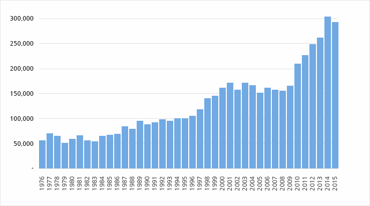 1976년~2015년(FY) 미국 실용특허 등록 건수 추이