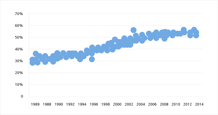 조사결과 : 특허출원 시 심사관에게 제출되는 참조문헌의 건수가 지속적으로 증가하고 있으며, 2015년에 등록된 특허의 경우에는 평균(average) 40개의 참조문헌이 제출된 것으로 나타남