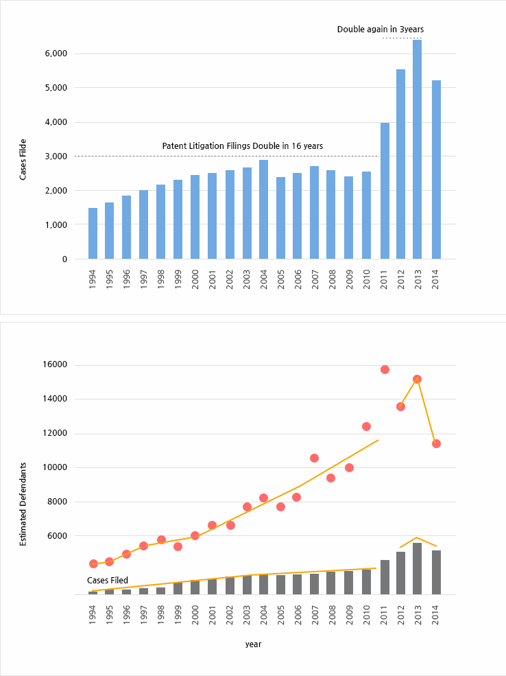 1994 – 2014년 미국 특허소송 및 평균 피고 수