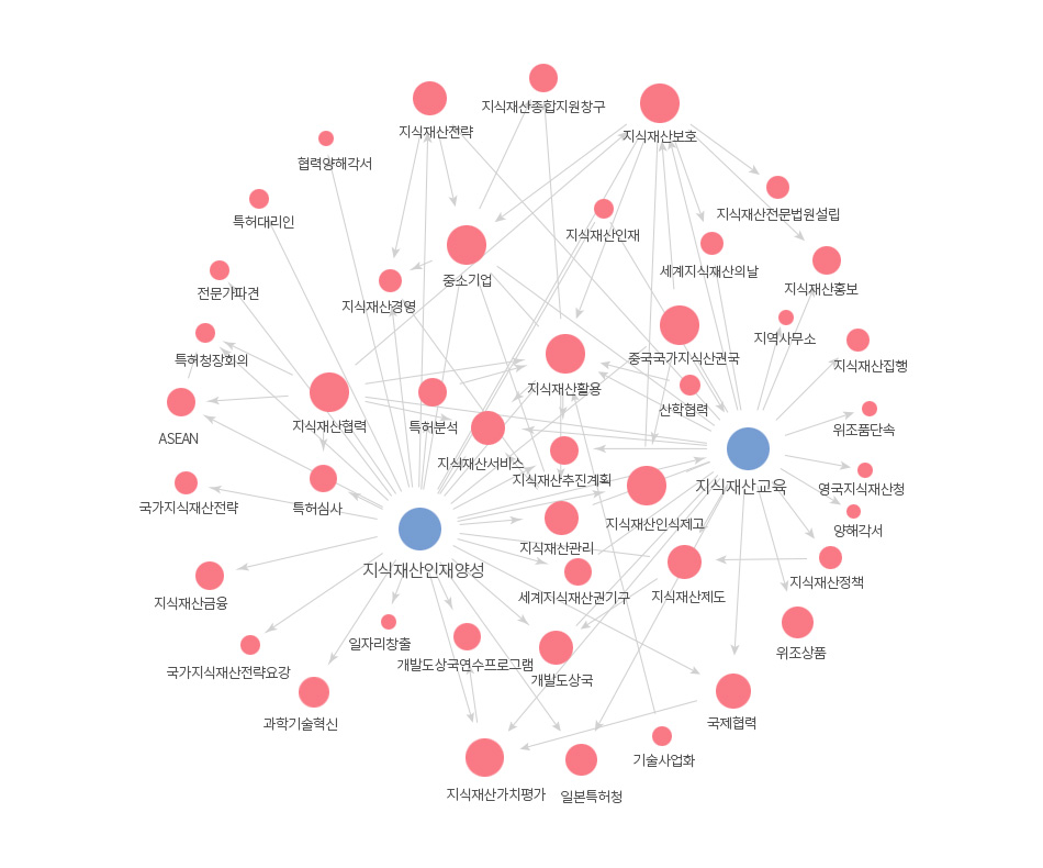 이번 7월호 Focus on IP Trend에서는 지식재산 활성화를 위하여 관련 분야의 전문인력을 양성하고 재교육하는 등의 인적자원의 성장전략을 살펴보고자 “지식재산 인재양성”을 주제로 선정하였다. 이에 대한 논의와 해결 방안 모색을 위해 한국지식재산연구원에서 발간된 「Issue & Focus on IP」 가운데 2009년부터 최근까지 국내‧외에서 수집된 기사를 통해 네트워크 분석을 실시하였다. 네트워크 분석 결과 “지식재산 인재양성”을 중심으로 지식재산교육, 지식재산협력, 지식재산인식제고, 중소기업, 지식재산관리 등의 연관 이슈들이 다음과 같은 네트워크 분석 결과로 도출되었다.