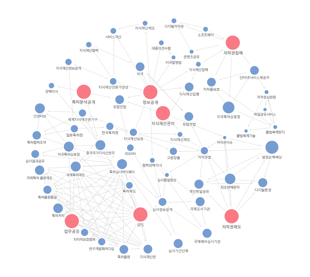 이번 Focus on IP Trend 8월호에서는 공유저작물, 기술공유, 공유경제, 경제활성화 등에 대하여 알아보고자 “지식재산과 공유”를 주제로 선정하였다. 이에 대한 논의와 해결 방안 모색을 위해 한국지식재산연구원에서 발간된 「Issue & Focus on IP」 가운데 2009년부터 최근까지 국내‧외에서 수집된 기사를 통해 네트워크 분석을 실시하였다. 네트워크 분석 결과 “지식재산과 공유”를 중심으로 정보공개, 업무공유, IP5, 특허분석공개, 지식재산관리, 저작권침해 및 저작권관리 등의 연관 이슈들이 다음과 같은 네트워크 분석 결과로 도출되었다.