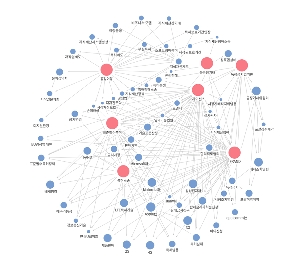 이번 Focus on IP Trend 9월호에서는 대중소기업간 공정거래, 기술탈취 예방, 국제표준에 연계된 합리적인 로열티 등에 대하여 알아보고자 “지식재산과 공정거래”를 주제로 선정하였다. 이에 대한 논의와 해결 방안 모색을 위해 한국지식재산연구원에서 발간된 「Issue & Focus on IP」 가운데 2009년부터 최근까지 국내ㆍ외에서 수집된 기사를 통해 네트워크 분석을 실시하였다. 네트워크 분석 결과 “지식재산과 공정거래”를 중심으로 FRAND, 공정이용, 라이선스, 표준필수특허, 특허소송, 독점금지법위반, 불공정거래, RAND, 지식재산제도 등의 연관 이슈들이 다음과 같은 네트워크 분석 결과로 도출되었다.