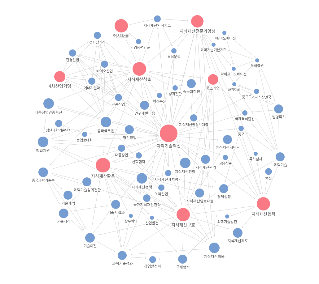 이번 Focus on IP Trend 10월호에서는 과학기술혁신, 혁신창출 등에 대하여 알아보고자 “지식재산과 과학기술”을 주제로 선정하였다. 동 주제에 대하여 서로 다른 영역의 활동들이 서로 연관관계를 가지고서 영향을 미치게 되는데, 이에 대한 논의와 해결 방안 모색을 위해 한국지식재산연구원에서 발간된 「Issue & Focus on IP」 가운데 2009년부터 최근까지 국내‧외에서 수집된 기사를 통해 네트워크 분석을 실시하였다. 네트워크 분석 결과 “지식재산과 과학기술”을 중심으로 과학기술혁신, 혁신창출, 지식재산협력, 지식재산전문가양성, 중소기업, 4차산업혁명 등의 연관 이슈들이 다음과 같은 네트워크 분석 결과로 도출되었다.