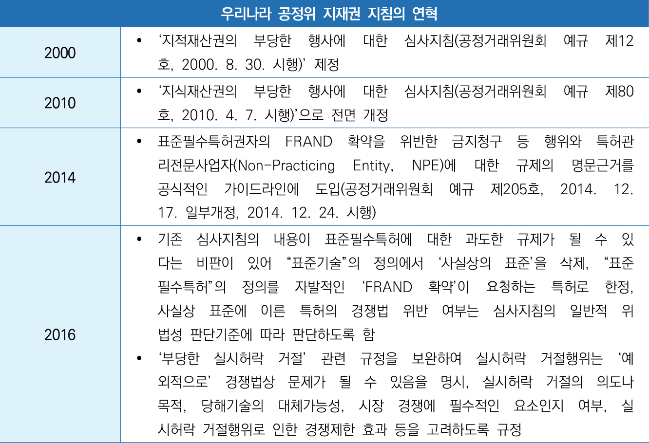 FRNAD 선언한 표준필수특허권자의 권리행사의 문제, NPE의 무차별적 소송제기, 무효사유가 있는 특허권에 기한 권리행사 등 지식재산권의 행사로 인해 경쟁과 혁신이 저해되는 사례에 대한 문제가 대두되었다. 일정기간 독점을 보장하여 기술혁신을 촉진하고자 하는 지식재산권법과 과도한 시장독점을 방지하여 자유로운 경쟁을 유도하고자 하는 경쟁법은 그 법목적상 필연적으로 교차 영역이 발생된다.