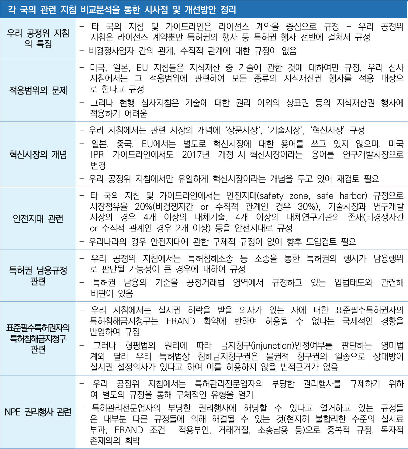 각국의 지침 및 가이드라인은 라이선스 계약을 중심으로 규정하고 있는데, 우리 지침에서는 라이선스 계약뿐만 아니라 특허권자의 침해소송, 표준기술 관련 특허권의 행사, 특허분쟁과정에서의 합의(역지불 합의 포함) 등 구체적 유형 전반에 걸쳐서 규율하고 있다는 점이 특징이다. 또한 우리 공정위 지침에서는 비경쟁사업자 간의 관계, 수직적 관계에 대한 별도의 규정이 없으며, 경쟁법 적용이 면제되는 시장점유율이나 대체기술의 수에 관하여 구체적 수치를 규정한 안전지대 규정이 없다.
