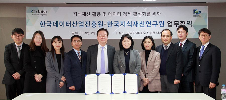 한국지식재산연구원(원장 권택민)은 한국데이터산업진흥원(원장 민기영)과 2019년 2월 18일(월) 업무협약을 체결했다. 이번 협약을 통해 양 기관은 지식재산의 활용을 통한 데이터 경제 활성화 및 국민경제 발전에 이바지 할 계획이다.
