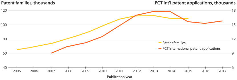 그린 에너지 기술 관련 특허 패밀리 및 PCT 특허출원 건수(2005~2017)