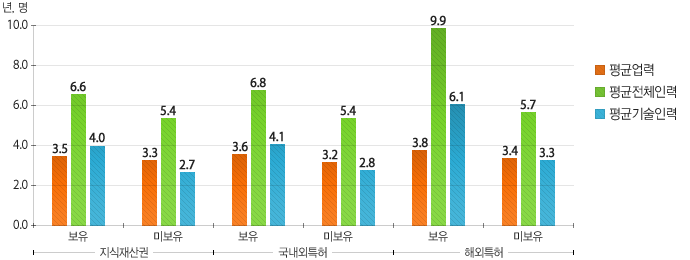 분석대상 스타트업의 특성: 지식재산권의 범위 구분 보유 스타트업 미보유 스타트업 지식재산권(국내외 특/실/상/디) 194개 (77.0%) 58개 (23.0%) 지식재산권 중 국내외 특허 165개 (65.5%) 87개 (34.5%) 지식재산권 중 해외 특허 36개 (14.3%) 216개 (85.7%) 지식재산권의 범위에 관계없이 이를 보유한 기업이 그렇지 않은 기업에 비해 평균 업력, 인력 수, 기술인력 수, 매출액, 연구개발비 모두 많은 것으로 나타남- 지식재산권의 범위가 좁아질수록(범위 예시: 지식재산권 > 국내외 특허 > 해외 특허) 이를 보유한 스타트업과 보유하지 못한 스타트업 간 평균 업력, 인력 수, 기술인력 수, 매출액 등에서 격차가 커지는 특징을 살펴볼 수 있음