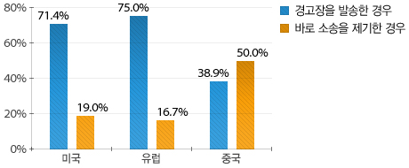 중국 기업들은 분쟁을 시작하는 형태도 다른 외국 기업들과 차이를 보였다. 미국과 유럽 기업은 우리 기업에 경고장을 발송함으로써 분쟁을 시작한 경우가 대부분인데 비해, 중국 기업들은 경고장을 발송하지 않고 바로 소송을 제기한 경우가 약 50%를 차지하였다. 또한 우리 기업들이 연루된 지식재산 침해 분쟁이 실제 소송에 이른 비율도 중국의 경우 72.2%로 미국(14.3%)과 일본(14.3%) 등 다른 국가에서의 분쟁과 커다란 차이를 보였다.