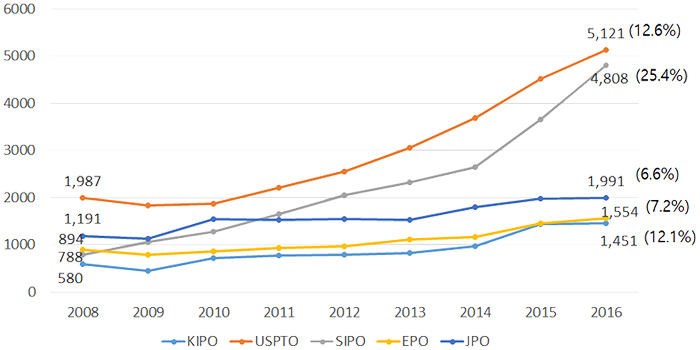 IP5 특허청에 접수된 자율주행차 관련 특허출원 현황