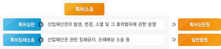 특허심판이란, 산업재산권(특허·실용신안·상표·디자인)의 발생, 변경, 소멸 및 그 권리범위에 관한 분쟁을 해결하기 위한 특별행정심판을 말한다. 특허심판에는 거절결정 불복심판, 무효심판, 권리범위 확인심판 등이 있고, 전문적인 기술지식과 경험이 필요하기 때문에 특허청 소속 특허심판원에서 하고 있다. 이와 달리 산업재산권 관련 침해금지, 손해배상 소송 등의 특허침해소송은 일반법원(서울중앙, 대전, 대구, 부산, 광주 등 전국 5개 지방법원이 1심 담당, 다만 서울중앙지방법원의 중복관할 인정)에서 담당한다.