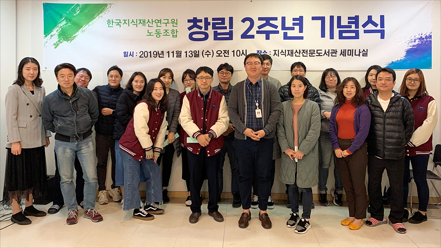 한국지식재산연구원노동조합은 2017년 11월 13일에 처음으로 설립된 2년차 노동조합입니다. 이후 노조는 2018년 노사 상생을 위한 노조활동 보장 우선협약을 비롯한 임금과 단체협약 등을 체결하였으며, 지금도 직원들의 근무환경 및 임금․복지 관련 규정 개정에 있어 직원들의 의견을 수렴하여 연구원과 협의를 진행하고 있습니다.