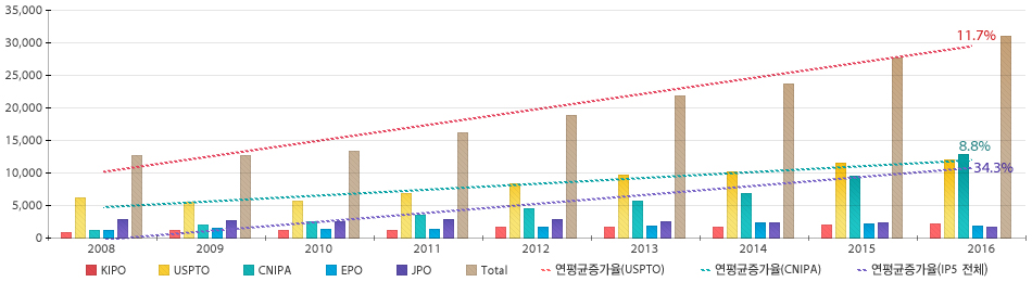 본 보고서에 따르면, 2008년부터 2016년까지 한국, 미국, 유럽, 중국, 일본의 IP5 특허청이 인공지능과 관련해 접수한 특허출원은 연평균 약 11.7% 증가하여 다른 기술 분야에 비해 증가세가 큰 것으로 나타났다. 특히 중국에서 인공지능 관련 특허출원이 급증했는데, 중국 특허청(CNIPA)에 접수된 인공지능 특허출원은 연평균 증가율이 약 34.3%에 달했다. 이와 같은 공격적 특허활동을 통해 중국은 2016년에는 인공지능 특허출원 건수가 최초로 미국을 역전해 세계 1위를 기록하기도 했다.