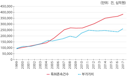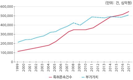 제조업의 연도별 특허 존속 건수 및 부가가치 추이