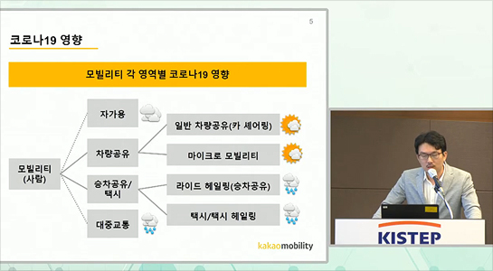 이재호 카카오모빌리티 디지털경제연구소장은 코로나19의 영향으로 전 세계의 이동이 정체된 가운데 모빌리티 서비스 각 영역(자가용, 차량공유, 승차공유, 대중교통 등)에서 일어나는 변화를 분석하고 모빌리티의 미래에 대한 전망을 발표하였으며, 자율주행 로봇을 이용한 방역, 생활용품 배송 및 검체 박스 이송 등의 사례를 통해 자율주행 기술의 개발 가속화에 주목하였다.