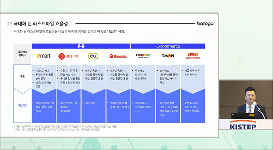 이상명 바로고 비즈세일즈 그룹장은 비대면 경제가 간소화시킨 서비스의 흐름을 살펴보고 배송, 구매 경험, 이동 등 세 가지 측면을 기준으로 비대면 경제에서 물류는 서비스의 옵션이 아닌 비즈니스의 목적임을 역설하였다. 더불어 획일화되고 정형화된 물류시스템 속에서 다양한 소비자의 욕구(배송시간 및 속도)에 대한 니즈가 커지면서 라스트 마일(고객과의 마지막 접점)을 잡는 자가 물류와 유통을 아우르는 강자가 될 것으로 전망하였다.