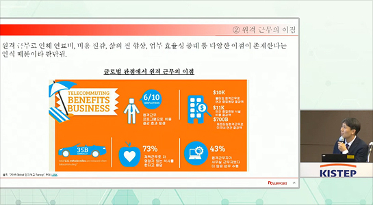 다음으로 신동형 알서포트 전략기획팀장은 코로나19 이전의 원격근무는 선택적 관점에서 접근하였다면 코로나19 이후에는 단절, 격리된 환경 속에서 선택이 아닌 필연적 관점에서 경험하고 있음을 설명했다. 향후 5G, 6G, XR, IoT, AI 등 기술 발전이 진행되면 특정 업무에 제한된 원격 근무가 더욱 폭넓은 업무에 적용될 것으로 예상하였다.