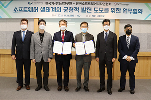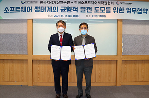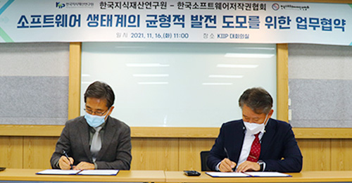 한국지식재산연구원(원장 손승우)은 11월 16일 한국지식재산연구원 대회의실에서 한국소프트웨어저작권협회(회장 유병한)와 소프트웨어(SW)·데이터 관련 저작권 분야 협력 강화와 가치평가 등 신사업 발굴을 위한 업무협약을 체결했다.
