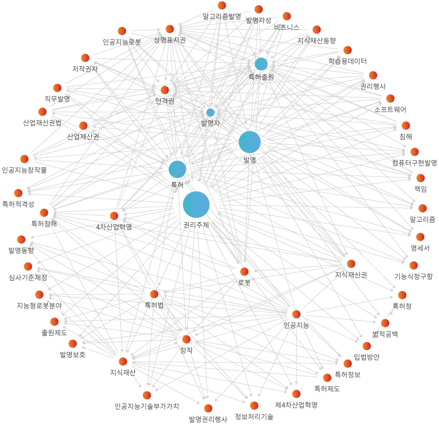 키워드 간 상관관계 분석 결과 '권리주체' 키워드를 중심으로 발명, 특허, 특허출원, 발명자 등의 키워드 상관관계가 높게 나타났으며, 그 뒤를 이어 인공지능, 성명표시권, 인격권, 특허법, 지식재산 등의 키워드 상관관계가 높게 나타났다. 인공지능의 발명자성에 연계된 주요 키워드 현황은 다음과 같다.
