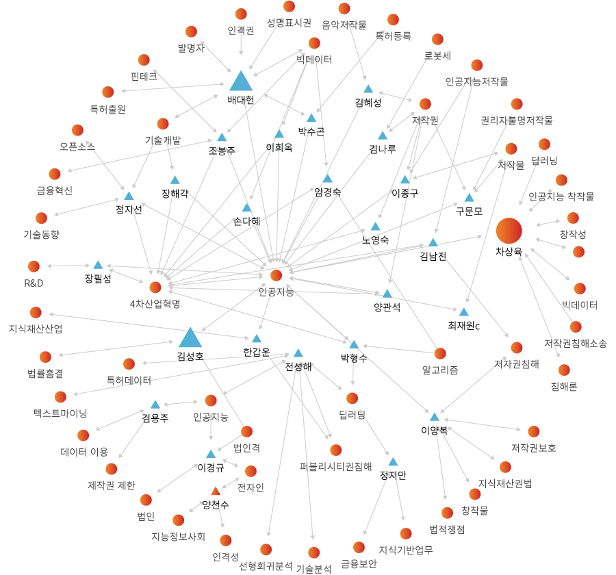 인공지능의 발명자성을 중심으로 한 다양한 연구주제와 연계된 차상육, 배대헌, 김성호 등 주요 연구자들의 인력 네트워크는 다음과 같이 형성되었다.