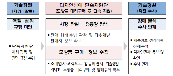 KIPO는 나날이 증가하는 디자인 침해 행위를 단속하고 신속·정확한 침해 수사 진행을 위해 한국지식재산보호원에 '디자인 침해 단속지원단'을 신설함