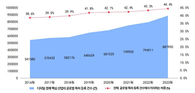 전체 2023년 디지털 경제 핵심 산업의 글로벌 특허 등록 건수는 887,900건으로 전년 대비 11.7% 증가하였으며, 이는 전체 글로벌 특허 등록 건수의 44.4%를 차지함