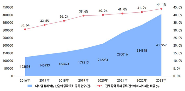전체 2023년 디지털 경제 핵심 산업의 중국 특허 등록 건수는 405,959건으로 전년 대비 21.2% 증가했으며, 이는 전체 중국 특허 등록 건수의 44.1%를 차지함