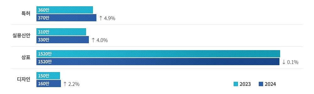 - 유일한 예외로, 상표의 출원 건수는 1,520만 건을 기록하며 정체 상태를 유지함
